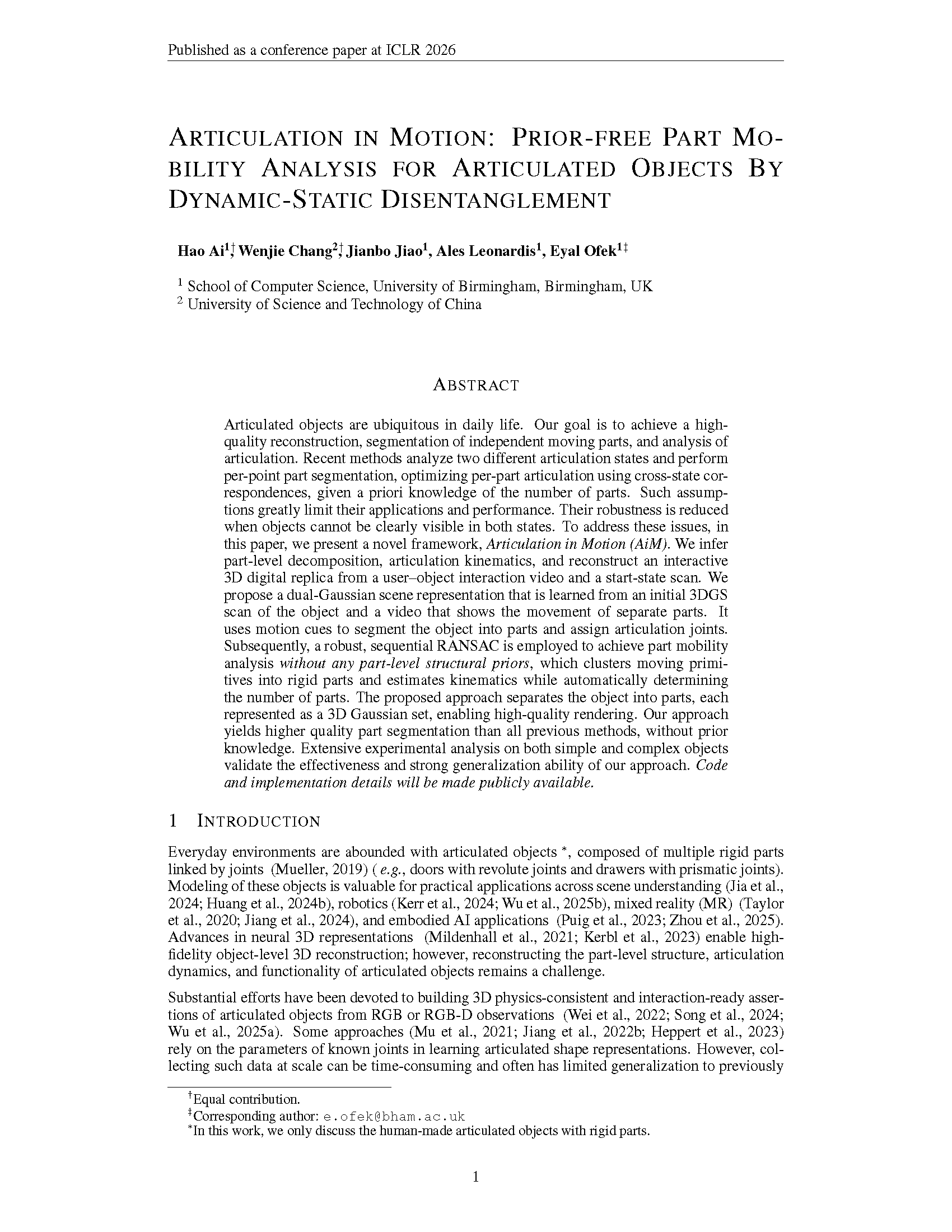 We propose a novel pipeline, AiM , to achieve articulated object reconstruction and part mobility analysis from the motion cues in a user–object interaction video and without any part-level structural priors, consisting of two key components: I) A novel dual-Gaussian representation analyzes the motion cues and achieves dynamic-static disentanglement; II) An optimization-free and prior-free sequential RANSAC clusters the dynamic Gaussians into rigid parts and estimates per-part articulation parameters.